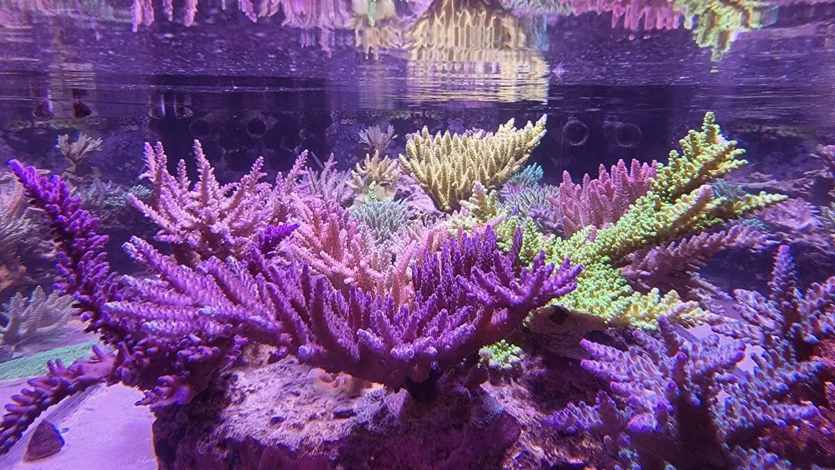 Our SPS coral aquaculture program focuses primarily on Acropora species, widely recognized as the gold standard for research-grade coral propagation. We maintain large 8-foot growout tanks dedicated exclusively to SPS coral, providing the high flow and intense lighting these species require. Our aquacultured Acropora specimens are grown under daylight spectrum at peak hours, promoting natural growth patterns and exceptional skeletal density.